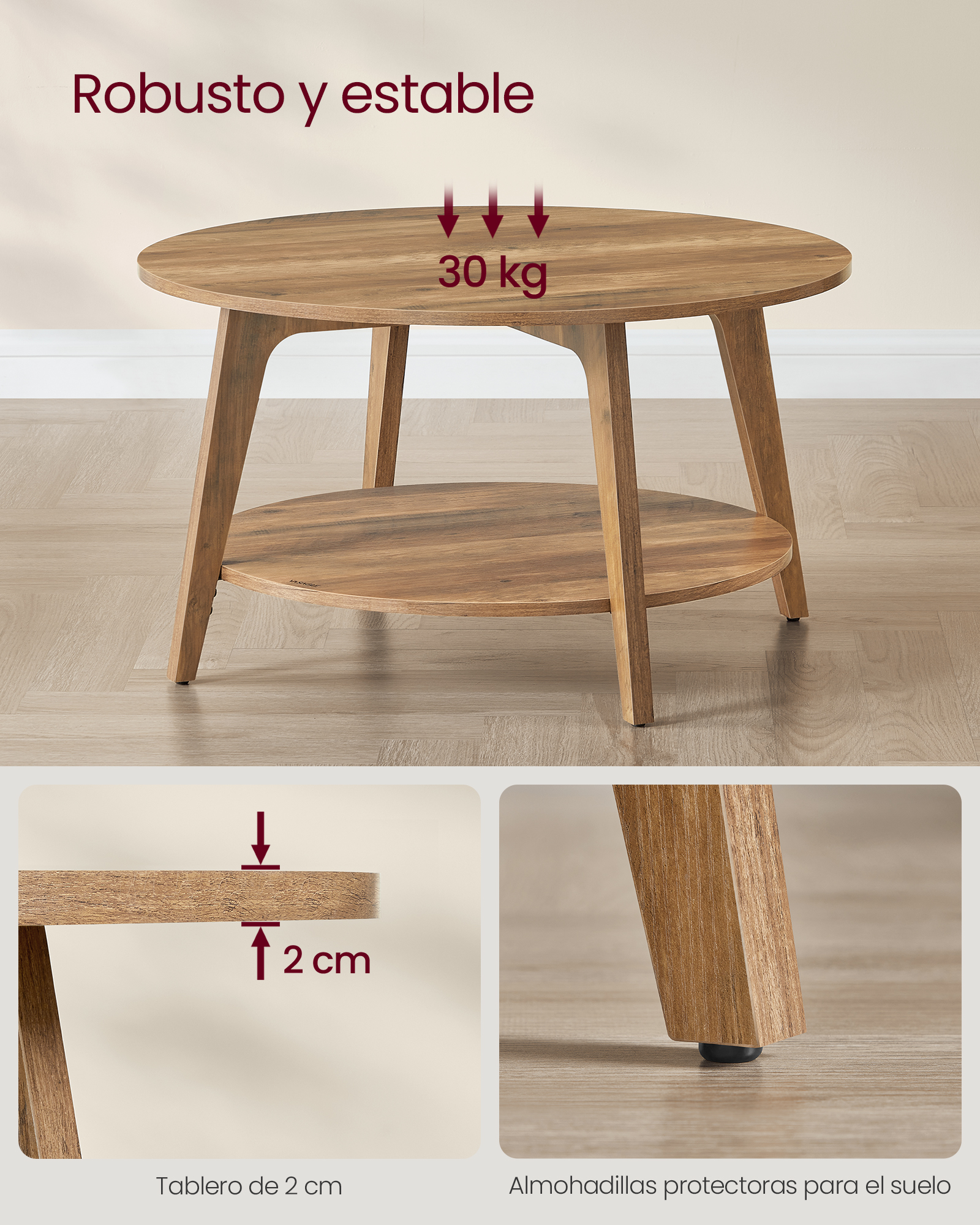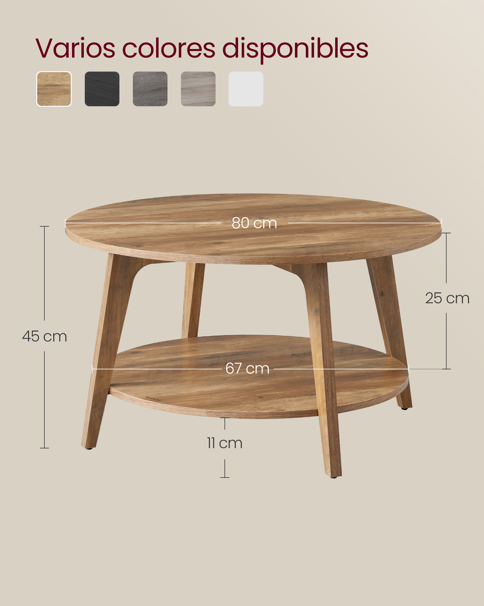 Con un diámetro de 80 cm y altura de 45 cm, esta mesa ofrece una superficie superior amplia y una repisa inferior adicional para mantener tus objetos esenciales siempre a la mano.💪 Estructura Robusta y Estable